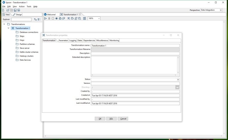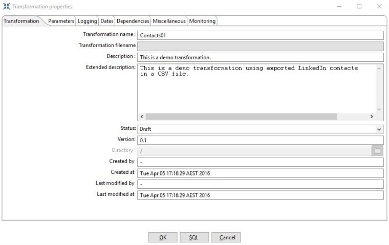 Edit your transformation name, description and other details so that it looks like the screenshot below and then click OK to close the properties window.