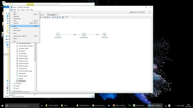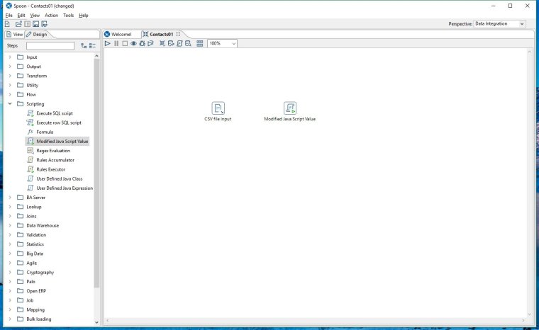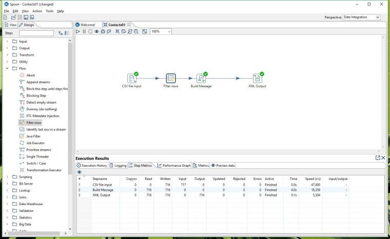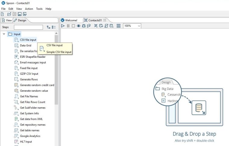The cool thing about Spoon is it allows us to design powerful data transformations in a visual manner with drag and drop capabilities. To start spoon run the bat file: