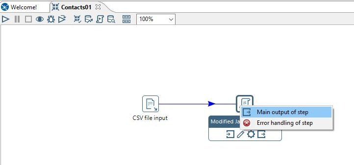 To connect the steps - hold shift & drag your mouse pointer from the CSV file input step towards the Modified Java Script Value icon. A line with directional arrow will appear and trun blue when it touches the new step. Release the mouse button and a menu appears - select "Main Output of Step" and the connection will now be in place. This connection is called a hop and it shows us the flow of data processing.