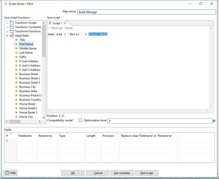 If you right click on our new Modified Java Script Value step and select Input Fields... you will be shown all the data fields that this step receives. Now close the fields window and lets move on.