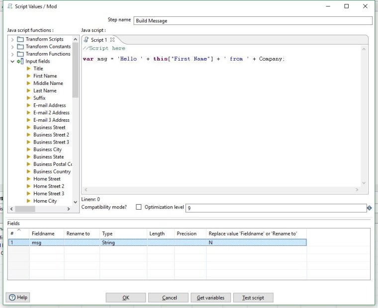 Note that 'First Name' and 'Company' are actual fields from the input step. A handy way to ensure you are using the correct names is to add them into the script by clicking on them from the list on the left.