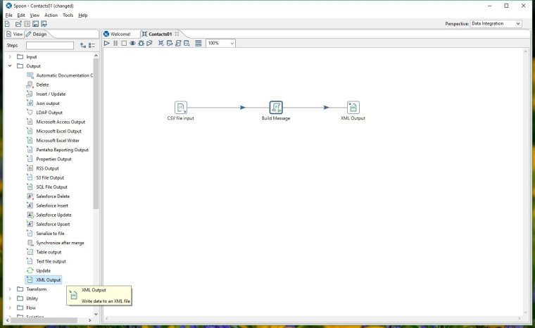 From the Output folder in the step palette select XML Output and drag it on to the workspace.
