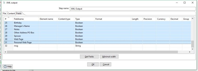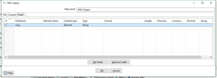 If you right click on our XML Output step and display Input Fields... you will see all the same fields in our data flow as before in addition to a new field: 'msg'. This shows that the new data generated in the Build Message step is being passed to this new step.