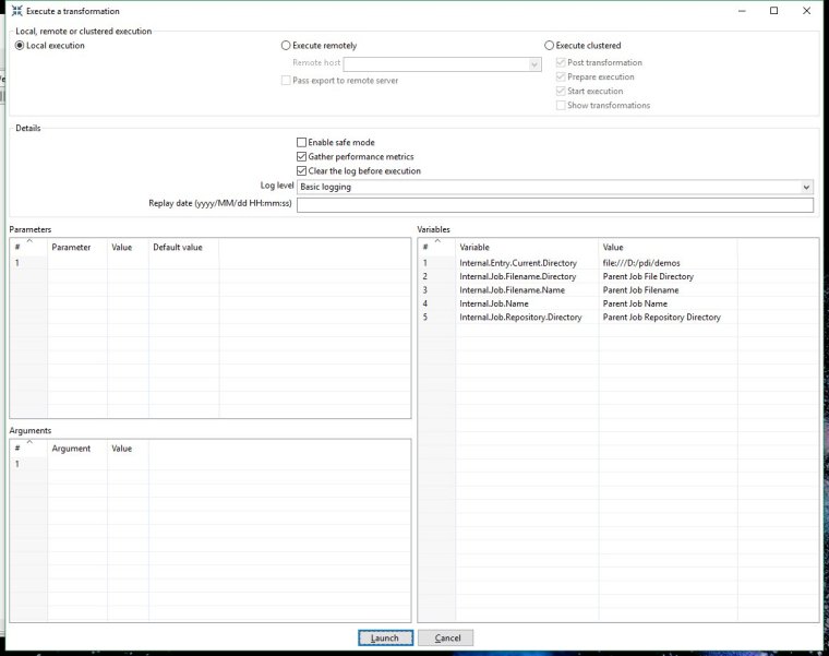 You will see a transformation execution window appear. All of the settings can be left as default - just check you are running locally.