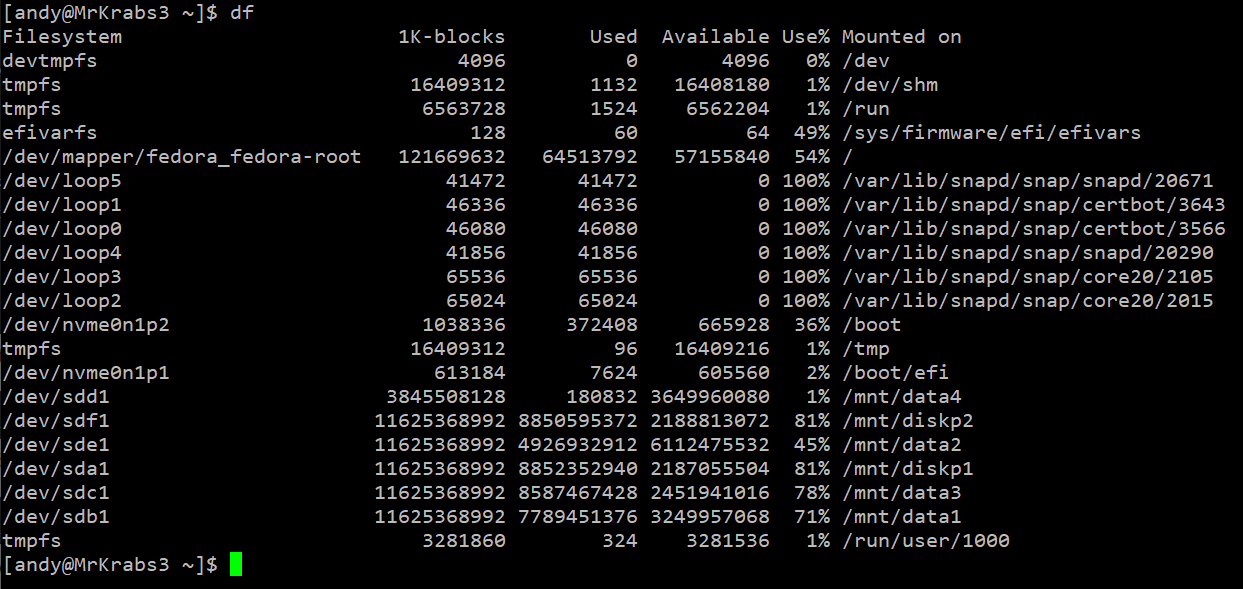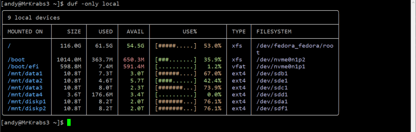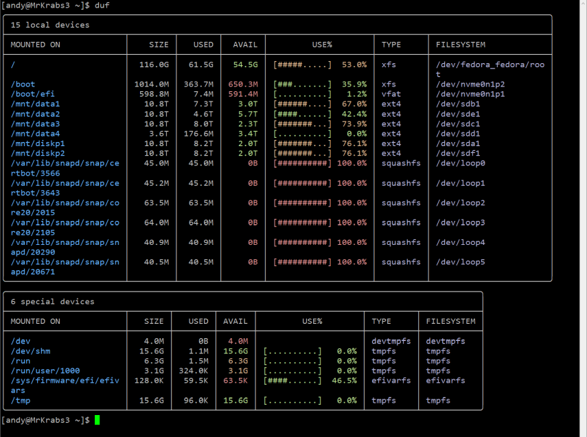 duf or disk usage free is a more recent utility and less likely to be installed by defualt on your Linux distro. Fortunately it has been pre-packaged for most Arch-based, DEB-based and RPM-based systems and should be easy to install from your repo.