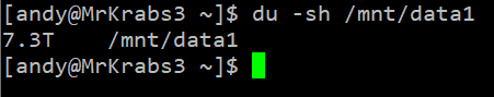 We can easily see that the /mnt/data1 directory is using about 7.3TB of space. This command can be helpful when you are trying to track down what is eating up your disk space.